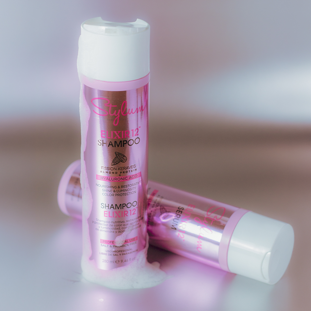 Línea Elixir 12Shampoo nutritivo y restaurador formulado con proteína de almendra y ácido hialurónico para cabello seco, maltratado, procesado y/o teñido. Prolonga la intensidad del color en cabello teñido y aporta sedosidad, brillo y luminosidad en todo tipo de cabello.